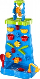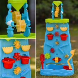 Ce mur d’eau coloré avec haute tour et cascades offre aux enfants une dose infinie de jeu avec l’eau et le sable. Grâce à la construction modulaire, ils peuvent modifier l’agencement des entonnoirs, rigoles et roues et observer la relation de cause à effet lors de l’écoulement de l’eau. La conception double face permet de jouer des deux côtés simultanément – idéale pour frères et sœurs comme pour amis.