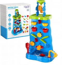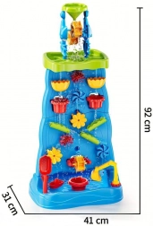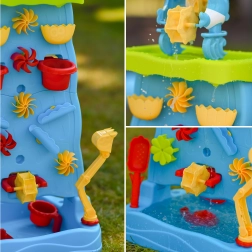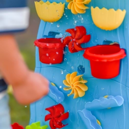 La large base et le mur accessible des deux côtés permettent un jeu partagé. Les enfants peuvent verser l’eau simultanément, observer les cascades et les roues en mouvement – idéal pour le partage et la coopération.