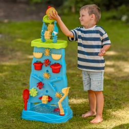 Le montage est rapide et sans outils. Sont inclus de nombreux accessoires : pelles, râteau, tamis, arrosoir, seau, moules et gobelets à eau. Le jouet stimule la perception sensorielle, la pensée logique et la résolution de problèmes, le tout sous forme d’expériences ludiques.