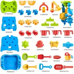 - 2× pelle, râteau, 2× tamis, arrosoir, seau, 4× moule, 5× gobelet à eau, 10× roue à eau, roue à eau double avec entonnoir, 3× rigole