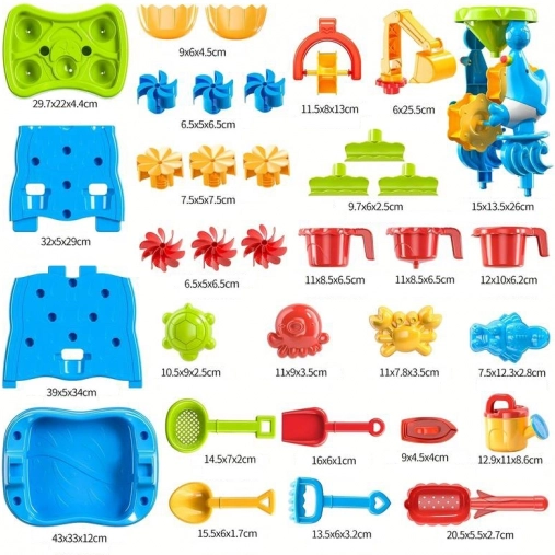 2× pelle, râteau, 2× tamis, arrosoir, seau, 4× moule, 5× gobelet à eau, 10× roue à eau, roue à eau double avec entonnoir, 3× rigole