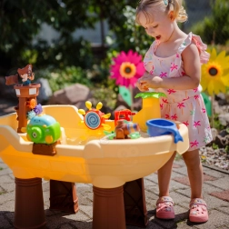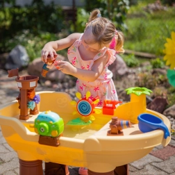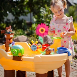 La table d’eau et de sable Woopie en forme de bateau pirate transforme la cour en baie d’aventures. Les enfants peuvent tirer de l’eau avec le canon, la faire descendre par le toboggan, faire tourner les petites et grandes roues à eau et souffler des bulles de savon. Grâce aux pieds stables et au plastique de qualité, la table est durable, sûre et adaptée à un usage quotidien.