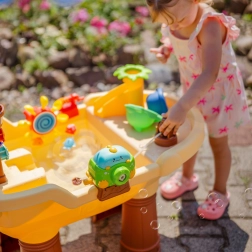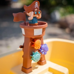 La tour avec pirate, le toboggan et les roues à eau réagissent lorsqu’on verse de l’eau. Les enfants découvrent la cause et l’effet, exercent leur motricité et développent leur imagination.