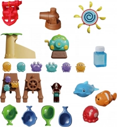 Le set comprend une tour de pirate avec nid, une figurine de pirate, une ancre, des gobelets pour transvaser et des animaux flottants qui favorisent le jeu sensoriel, la coordination œil‑main et la créativité. Le grand espace permet aux enfants de jouer confortablement à plusieurs et la conception simple facilite la vidange de l’eau et l’entretien.