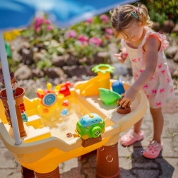 La tour avec pirate, la barre, l’ancre et le toboggan aquatique créent un univers pirate authentique. Les enfants versent l’eau dans les entonnoirs, font tourner les roues et lancent des parcours d’eau.