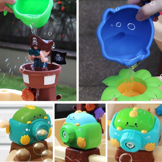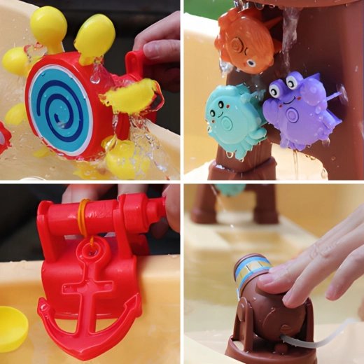 - Équipement riche : tour de pirate avec figurine, toboggan aquatique, canon à eau, générateur de bulles, ancre, barre, gobelets, petits animaux flottants et plusieurs roues à effets d’eau.
