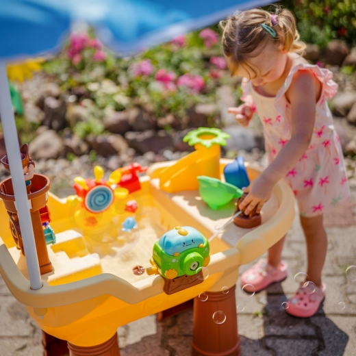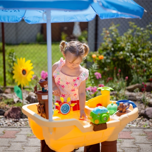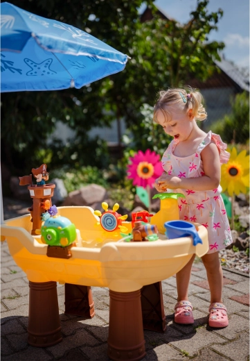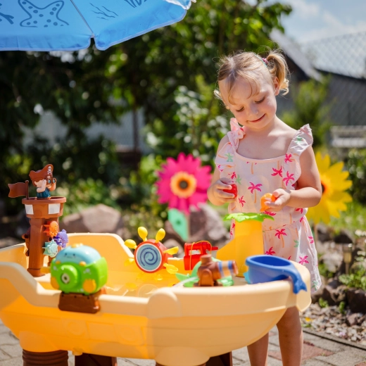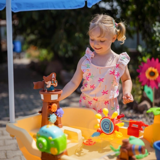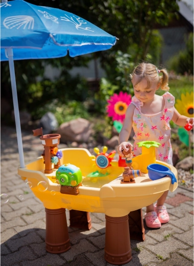 La grande table d’eau Woopie au design de bateau pirate transforme le jardin en une crique pleine de découvertes. Les enfants peuvent verser de l’eau, activer les roues, tirer au canon, faire des bulles et piloter le bateau grâce à la tour du pirate et à la barre. Le parapluie solaire intégré assure de l’ombre même par fortes chaleurs, pour un jeu confortable et sûr.