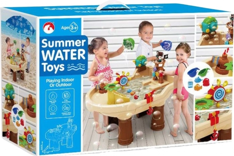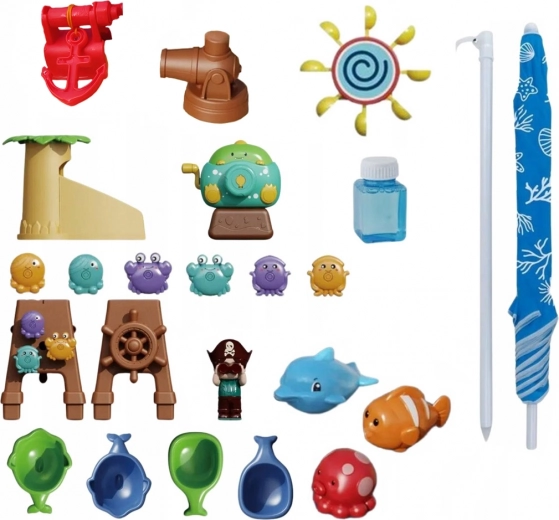 - table d’eau, canon à eau, générateur de bulles, toboggan aquatique, ancre, mât avec belvédère, figurine de pirate, 6 petites roues à eau, 1 grande roue à eau, 3 animaux flottants, 4 gobelets de transvasement, parapluie