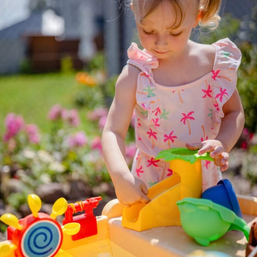 La structure robuste en plastique se monte facilement, se vide et se nettoie rapidement. Grâce à ses dimensions XL, la table est idéale pour frères et sœurs ou amis, et développe la motricité fine, les capacités de coordination et l’imagination via un jeu sensoriel avec l’eau.