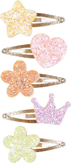 Ce superbe ensemble de barrettes comprend cinq pièces avec des ornements scintillants en forme d’étoile, de cœur, de fleur et de couronne. Les barrettes sont faciles à utiliser grâce au mécanisme à clip, ce qui garantit qu’elles restent bien en place toute la journée. Elles sont l’accessoire capillaire idéal pour chaque petite fille.