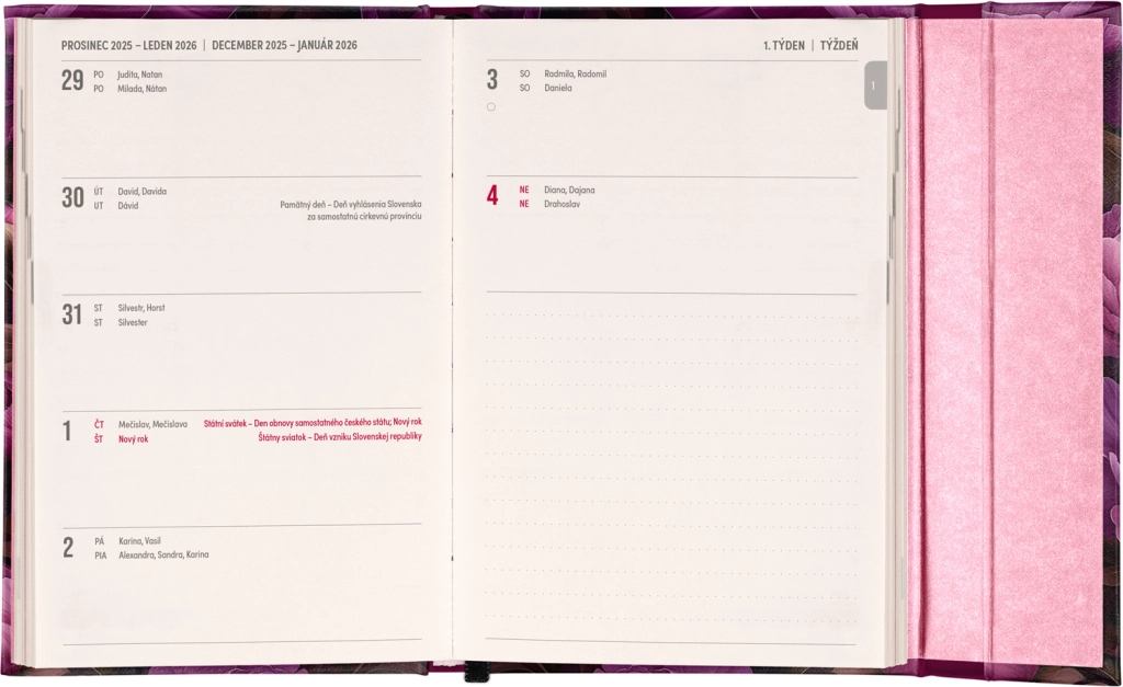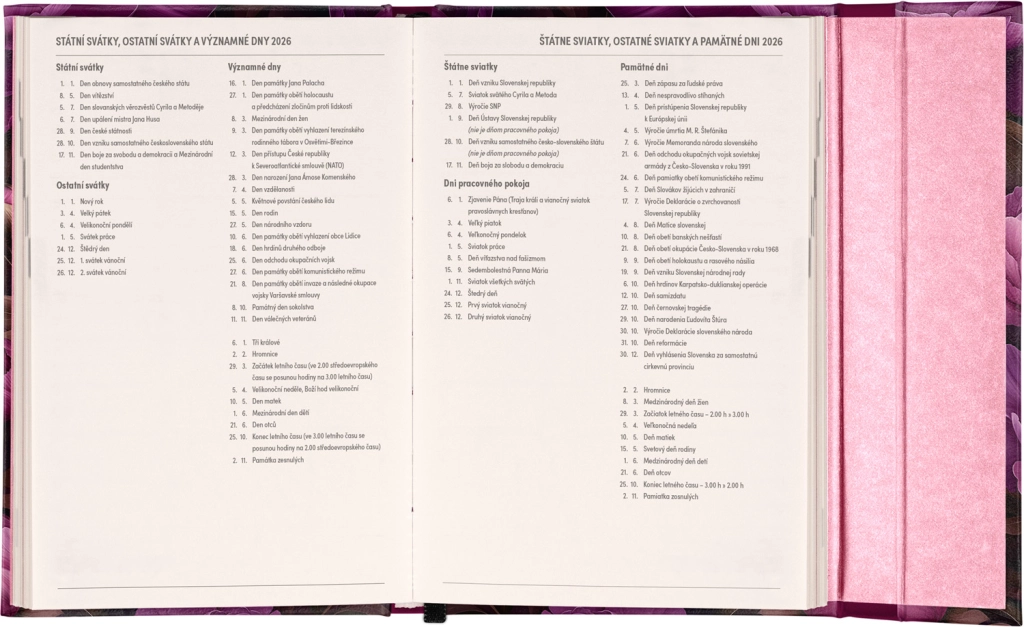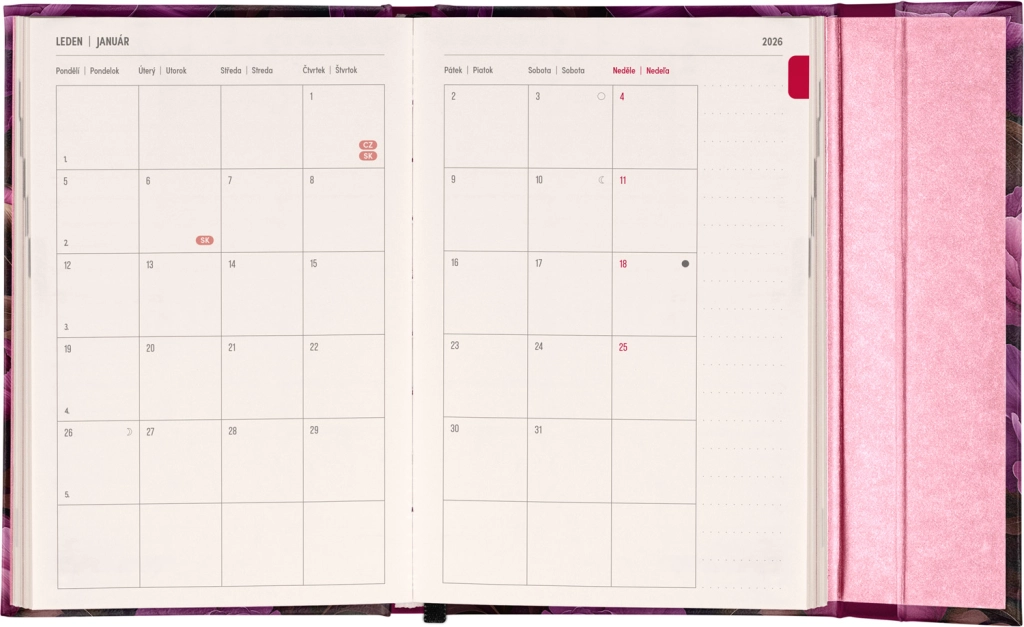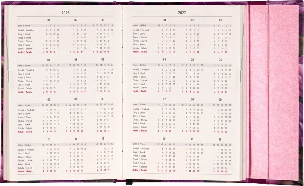 Cet agenda hebdomadaire au design floral violet offre tout ce dont vous avez besoin pour planifier efficacement votre temps tout au long de l’année 2026. La fermeture magnétique pratique garantit que toutes vos informations restent bien en sécurité. L’agenda est doté d’une mise en page horizontale qui permet de visualiser facilement la semaine sur deux pages.