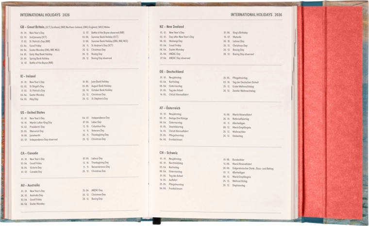 L'agenda est en langue anglaise et inclut un aperçu des jours fériés internationaux, ce qui facilite la planification à l'échelle mondiale. Grâce à la fermeture magnétique pratique, vous n'avez pas à craindre la perte de notes importantes ou la dissimulation d'informations significatives.