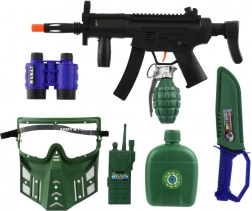 Préparez-vous à l’aventure avec ce set militaire comprenant un pistolet-mitrailleur à clics en plastique et des accessoires thématiques, idéal pour développer l’imagination et le jeu actif.