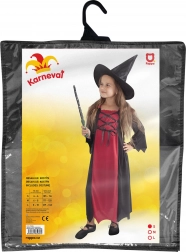 Le costume comprend une robe noire et rouge à la coupe longue avec un laçage détaillé, créant un style de sorcière authentique. Parfait pour Halloween ou les fêtes de carnaval.