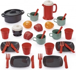 Assiettes, couverts, verres, tasses, petite théière avec couvercle, casserole avec couvercle, fruits