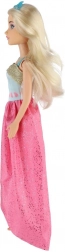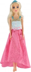 La longue jupe rose brillante avec un corsage bleu contrasté donne à la poupée un look exceptionnel – idéal pour un bal ou un défilé de mode.