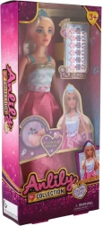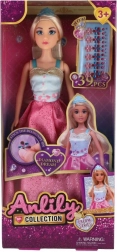 La poupée Anlily de 30 cm séduit par sa robe élégante et scintillante dans des tons roses, avec des détails bleus et dorés. Le style est complété par un serre-tête et de longs cheveux réalistes qui invitent au coiffage et à la création de coiffures. Le coffret comprend également de petites décorations « diamant » qui apportent une touche de luxe au jeu.