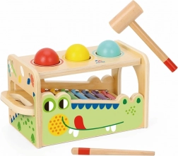 Découvrez le monde des sons et du rythme avec ce jouet amusant qui combine un banc à marteler et un xylophone. Le mignon crocodile avec xylophone intégré est idéal pour développer la motricité fine et l’ouïe. Après un coup de marteau, les boules en bois tombent, jouent sur le xylophone et créent une mélodie. Grâce aux touches de xylophone colorées, il est aussi possible de jouer séparément.