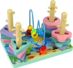 La base comprend un labyrinthe avec 7 perles de différentes couleurs et formes, que les enfants peuvent faire glisser le long du parcours. Ce jouet développe des compétences telles que l’imagination spatiale, la précision et les habilités manuelles.