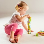 Le jeu avec les cubes soutient également le développement de la compréhension de l’équilibre lors de la construction de tours et de la relation de cause à effet lors de la démolition.