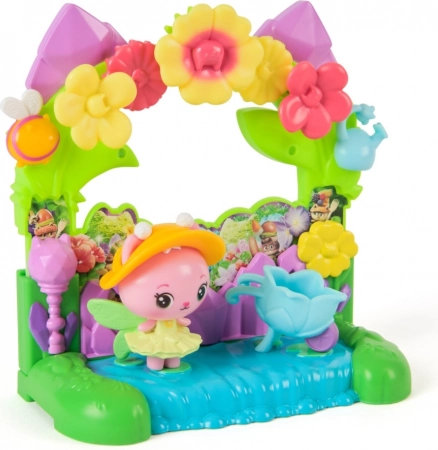 - Jeu imaginatif : scène de jardin avec arche fleurie et plate-forme « aquatique ».