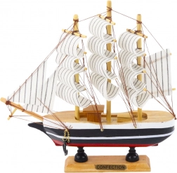 Ce modèle compact de trois-mâts est une réplique élégante d’un navire classique au design contrasté en noir, blanc et rouge. Ses voiles caractéristiques à fines rayures et son gréement réaliste, associés à la structure à trois mâts, en font une pièce idéale à exposer.