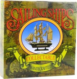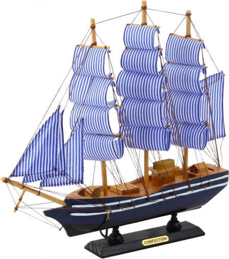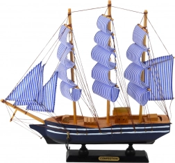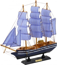 Ce modèle décoratif de voilier à trois mâts avec voiles rayées bleu et blanc est fabriqué en bois de haute qualité, avec des voiles en textile et un gréement détaillé. La coque bleu et blanc élégante avec un socle noir forme un ensemble esthétique qui s’intègre parfaitement aux intérieurs stylés. Malgré ses éléments classiques, il apporte aux pièces un aspect moderne et léger.