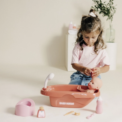 La baignoire pour poupées SMOBY BABY NURSE est un excellent set pour les petits soigneurs. Elle comprend une grande bassine avec robinet intégré et une douchette amovible à fonction de rotation mécanique, rendant le bain de la poupée très réaliste. Après le bain, les enfants peuvent nourrir la poupée avec le biberon et s’occuper de son hygiène quotidienne.