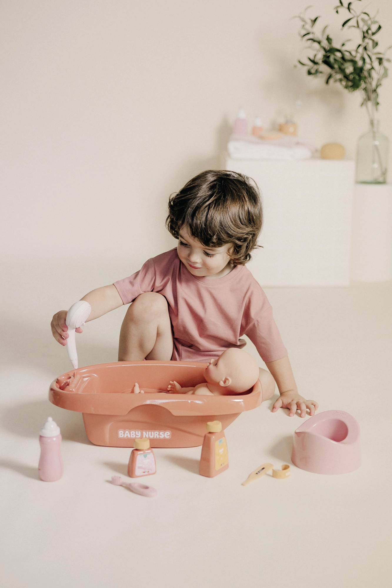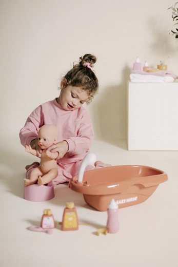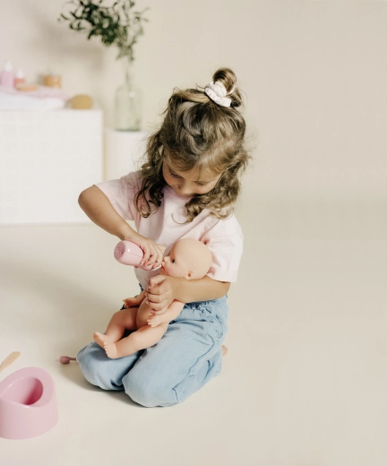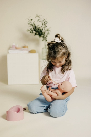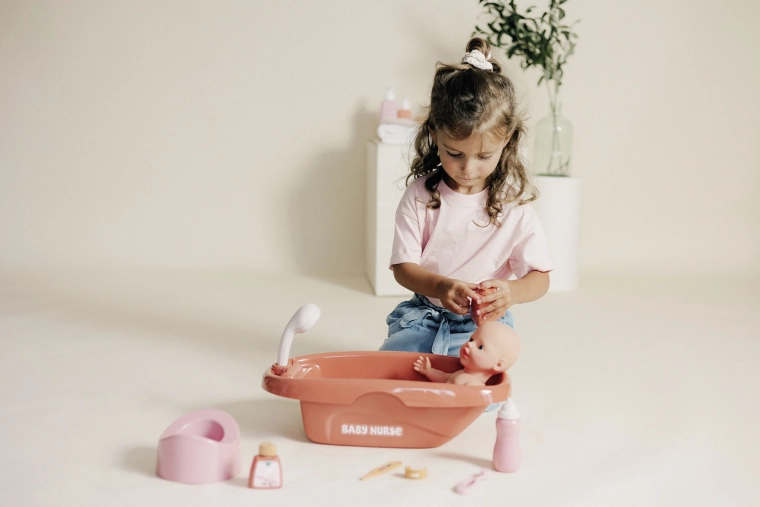 - Jeu réaliste – bain, repas et soins de la poupée.
