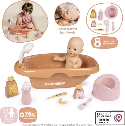- baignoire pour poupées, douchette amovible (mécanique), biberon de lait, brosse à dents, petit pot, thermomètre, bracelet, 2 flacons avec accessoires de soin