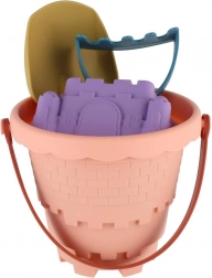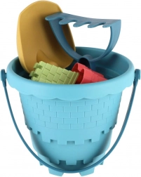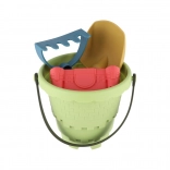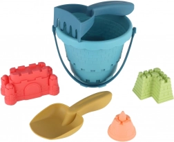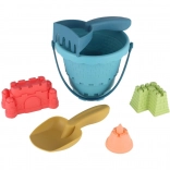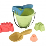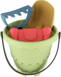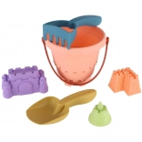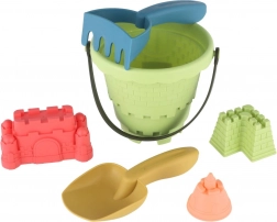 Un seau, une pelle, un râteau et trois moules pour construire et façonner le sable, réunis dans un ensemble léger.