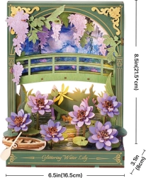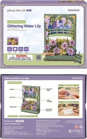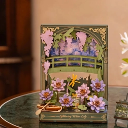 Plongez dans le monde de l’art et de la détente avec notre modèle 3D unique des Nénuphars Scintillants, inspiré des célèbres œuvres de Monet. Une fois assemblé, ce puzzle présente une scène féerique avec des fleurs finement détaillées, une barque et un pont en bois, qui instaurent une atmosphère de calme et de bien-être. L’éclairage LED confère à la décoration une ambiance magique inimitable évoquant le jeu de la lumière au coucher du soleil.