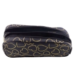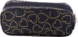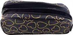 Fabriquée en textile résistant à léger effet satiné, la trousse se distingue par son motif de cœurs dorés sur un fond noir intense. Des fermetures éclair robustes assurent la sécurité du contenu. Sa construction souple et flexible permet un rangement aisé dans un sac à dos ou un cabas sans encombrer.