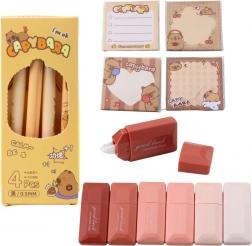 Le set comprend un riche assortiment d’accessoires sur le thème des capybaras, incluant : 4 stylos à encre noire, 6 gommes correctrices, 4 lots de notes adhésives décoratives, une peluche capybara avec broche, un porte-clés capybara, 2 pinces à motif capybara et 5 autocollants amusants. Ce produit est un cadeau idéal pour les élèves, les amoureux des animaux ou toute personne appréciant des accessoires d’apprentissage uniques.