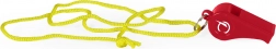 Sifflet en plastique rouge fixé à une lanière jaune, idéal pour la signalisation ou les activités sportives.