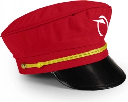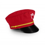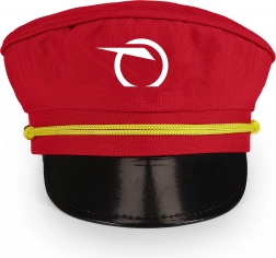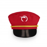 Casquette rouge élégante avec le logo de Železničná spoločnosť Slovensko, visière noire brillante et cordon jaune. Idéale pour jouer au chef de gare.