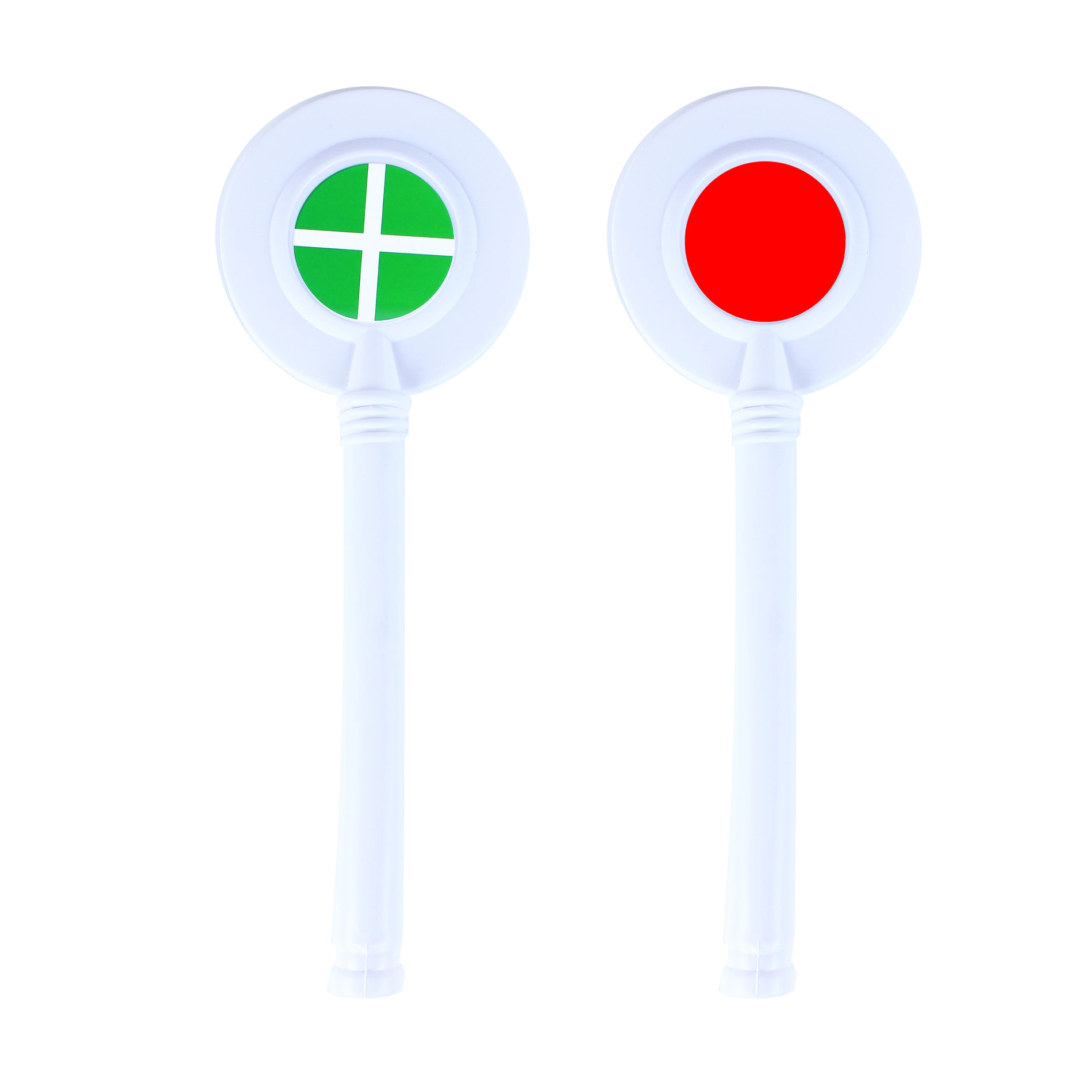 Deux palettes en plastique avec de longues poignées blanches, l’une avec un cercle vert et l’autre avec un cercle rouge. Idéales pour le jeu et la signalisation lors de l’entraînement.