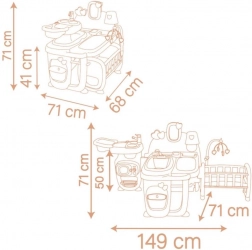 La salle de bain comprend une petite baignoire amovible et une table à langer, tandis que la cuisine contient un évier avec robinet factice, une plaque de cuisson et un four micro-ondes avec étagères de rangement. La chambre est équipée d’un lit pour poupée et d’un mobile rotatif avec lampe phosphorescente.