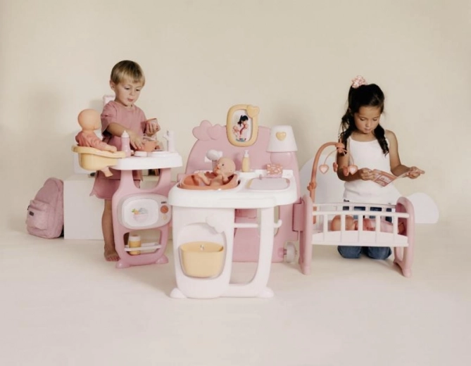 Centre de jeu pour poupées Baby Nurse avec trois zones, pliable et facile à transporter. Parfait pour les poupées jusqu’à 42 cm.