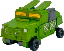 Transformez la figurine d’action en un robuste véhicule de combat vert en quelques étapes. Les roues et panneaux visibles indiquent où plier, accessible même aux enfants.