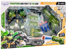 Entrez en action avec le set dynamique WOOPIE : un robot transformable vert qui se change en un clin d'œil en véhicule de combat, et un pistolet à mousse sécurisé avec fléchettes pour un maximum de fun. Idéal dès 3 ans, il développe la créativité, la pensée logique et la motricité fine.