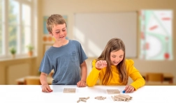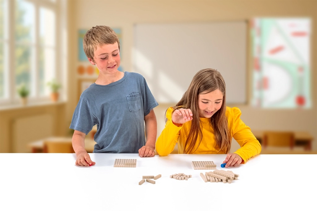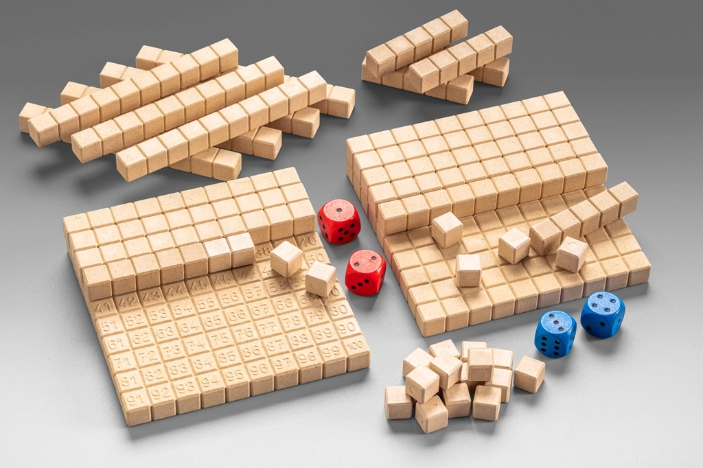 Contenu du coffret : deux plateaux avec des nombres, 22 bâtons de dix, 6 bâtons de cinq, 28 cubes unitaires, des dés rouges et bleus, et un mode d’emploi multilingue. Le jeu convient au travail individuel comme au travail de groupe.