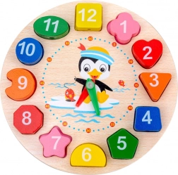 L’horloge dispose de deux aiguilles mobiles et d’indications des minutes, qui apprennent aux enfants à lire les heures pleines et améliorent leur aisance avec la notion du temps. Un joyeux pingouin figure sur le cadran, captant l’attention même des plus petits.