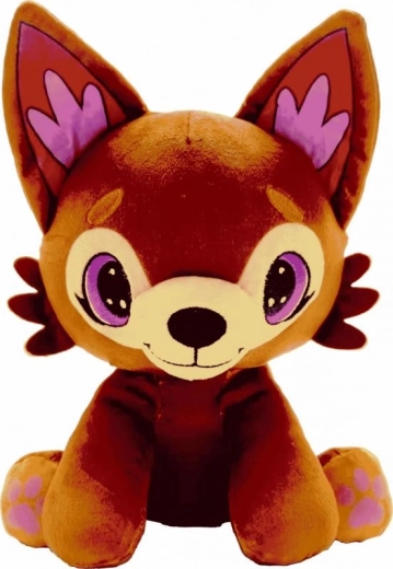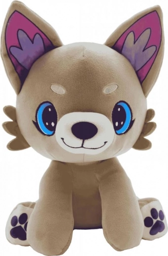 Une peluche marron aux yeux violets et au visage souriant. Idéale pour jouer et se blottir pour les enfants.