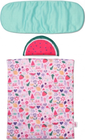Un petit coussin pastèque, un matelas/tapis moelleux et une couverture colorée à motifs fruités assurent le confort de la poupée pour le repos et l’endormissement.