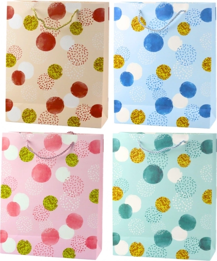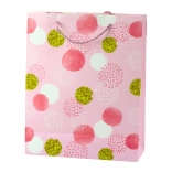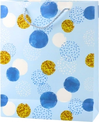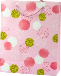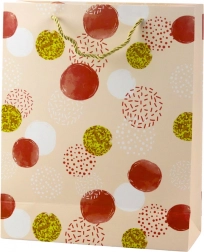 Des pois de différentes tailles, certains avec un effet scintillant ou une impression décorative, confèrent à l’ensemble un caractère original et spectaculaire. Le sac est fabriqué en papier laminé résistant, qui supporte les pliures et permet d’emballer en toute sécurité même des cadeaux plus lourds.