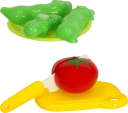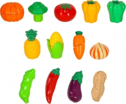 • Fruits et légumes à velcro (13 pcs) : pois en cosse, poivron vert, poivron jaune, piment, oignon, brocoli, maïs, tomate, ananas, citrouille, aubergine, haricots, carotte.