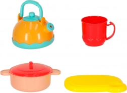 • Accessoires de cuisine (15 pcs) : petite théière, casserole avec couvercle, couverts (grand et petit couteau, petite cuillère, fourchette), tasse, planche à découper, petite plaque/cuisson pour enfants, panier.