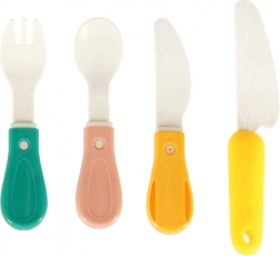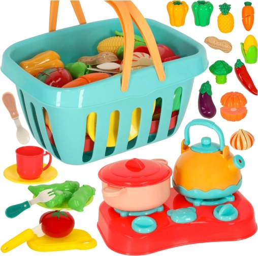 Grâce au grand nombre d’éléments, les enfants peuvent jouer au magasin, à la cuisine ou au restaurant. Couper, servir et « cuisiner » avec la petite théière, la casserole et la planche à découper développe l’imagination, la communication et encourage l’adoption d’habitudes alimentaires saines.