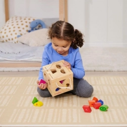 La boîte à formes est en bois agréable au toucher et, grâce à son ouverture, les formes se retirent facilement pour rejouer encore et encore.